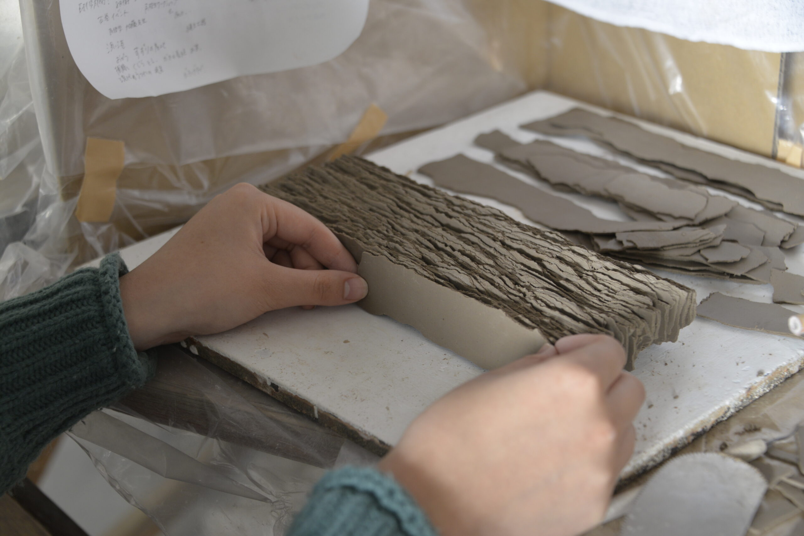 (※1)板づくり粘土を板状に伸ばし、それを切ったり、曲げたり、貼り合わせたりして形を作る技法。今回は板状の粘土を型にあてて器の形に成形する。